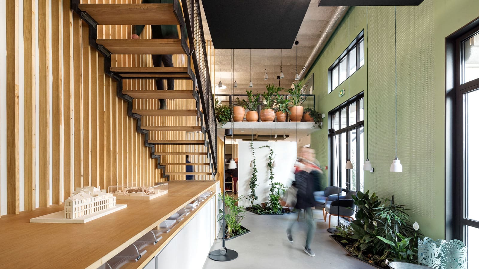 The architectural approach was guided by its DNA: to offer a new use while preserving the identity and soul of the building. Here, the facades and the dome, the woodwork and the remarkable elements, decorations, and modenatures were enhanced, combined with the use of contemporary, raw and natural materials. The inner courtyard of the building – previously a parking space – has become an island of freshness in the city, a lush garden with multiple species. The sensation of a permanent “inside-outside” is created by the omnipresence of the vegetation right up to the workplaces.